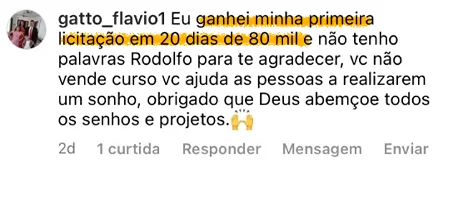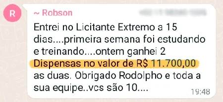 “Eu fazia Uber. Trabalha de 12 a 14 horas por dia. Hoje eu trabalho só com licitações e já estou faturando R$50.000,00 por mês. Hoje eu tenho uma qualidade de vida diferenciada. Se não fosse o Licitante Extremo, de repente eu ainda estaria dentro de um carro, trabalhando de Uber”.
