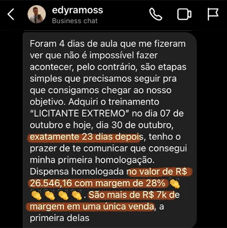 Nós temos muitos casos de alunos que realizam a sua primeira venda em poucos dias após iniciar o Licitante Extremo.
